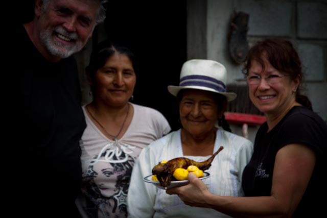 Back at the house, Sra. Rosa and Olga had roasted a Cuy just for us.  It is an Ecuadorian custom that without Cuy there is no celebration, be it a wedding, christianing, holiday, or visiting guests!  They wanted to celebrate us!!  So the night before, Pedro and his mom picked the plumpest Cuy and killed, cleaned and marinated it, while Bo and I watched and listened to Sr. Rosa tell us all about the importance of this wonderful delicacy.